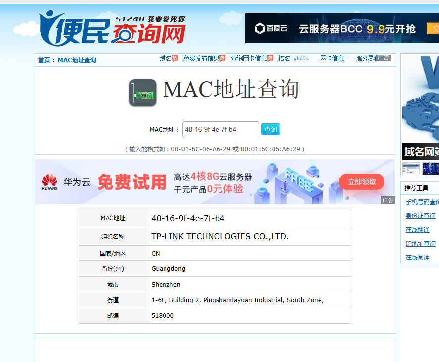 在一个案件中,获取了犯罪嫌疑人的一个MAC地址:40-16-9F-4E-7F-B4,请查询该MAC地址对应的厂商是(附截图)