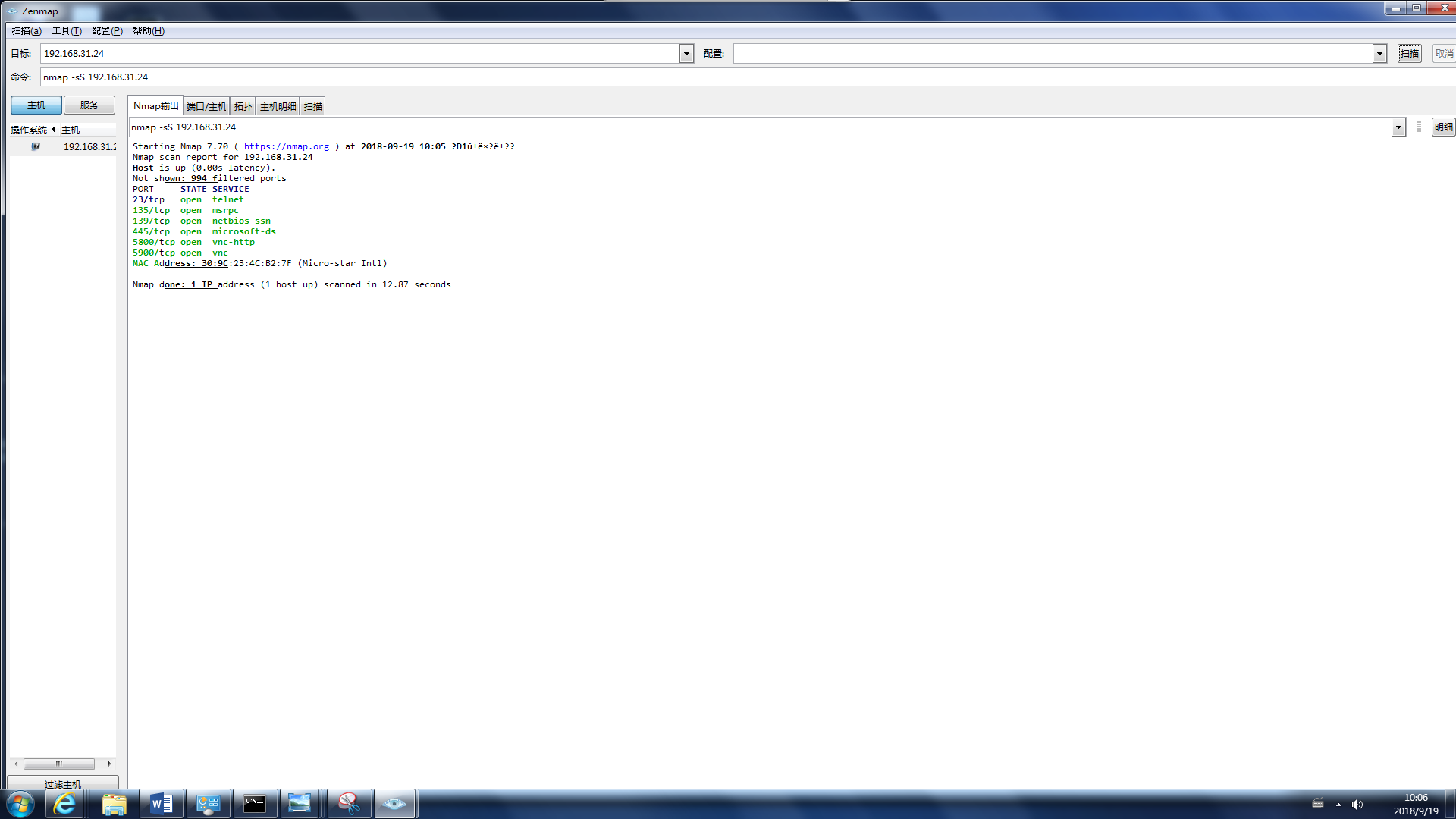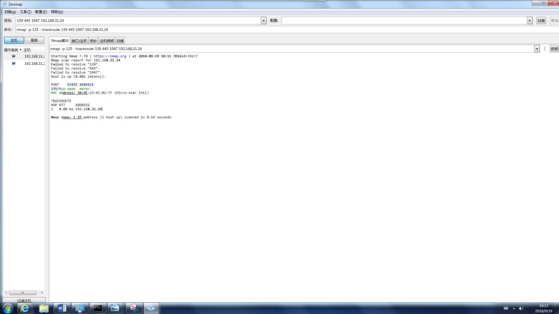 选择一个存活IP地址,扫描所开放的端口(分别用ping扫描,syn扫描尝试),并查询常用端口所对应的服务及操作系统信息。