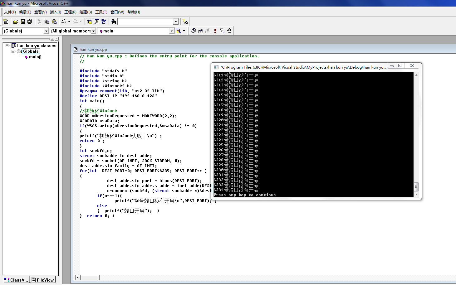 参考:#include "stdafx.h"<br>#include "stdio.h"<br>#include <string.h> <br>#include <Winsock2.h> <br>#pragma comment(lib, "ws2_32.lib")<br>#define DEST_IP "192.168.8.123"<br>int main() <br>{ <br>//初始化WinSock <br>WORD wVersionRequested = MAKEWORD(2,2); <br>WSADATA wsaData; <br>if(WSAStartup(wVersionRequested,&wsaData) != 0) <br>{ <br>printf("初始化WinSock失败!\n") ; <br>return 0 ; <br>} <br>int sockfd,n; <br>struct sockaddr_in dest_addr; <br>sockfd = socket(AF_INET, SOCK_STREAM, 0); <br>dest_addr.sin_family = AF_INET; <br>for(int DEST_PORT=0; DEST_PORT<6335; DEST_PORT++ )<br>{ <br> dest_addr.sin_port = htons(DEST_PORT); <br> dest_addr.sin_addr.s_addr = inet_addr(DEST_IP); <br> n=connect(sockfd, (struct sockaddr *)&dest_addr, sizeof(struct sockaddr)); <br> if(n==-1){ <br> printf("%d号端口没有开启\n",DEST_PORT); }<br> else<br> { printf("端口开启"); } <br>} return 0; }