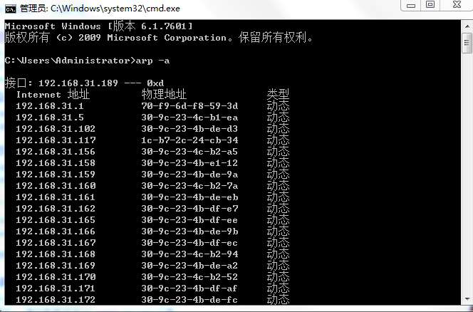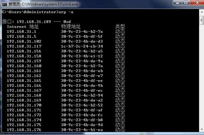 ARP欺骗前192.168.1.30机正常缓存表(实验中的IP可能和本IP不一样)