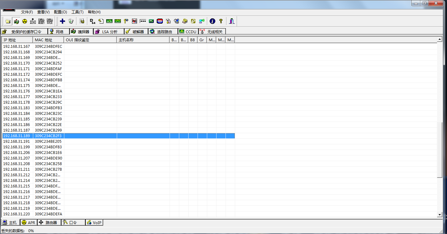 3、点选工具栏中的网卡图标,之后选择sniffer页,再选择左下角的hosts,右键选择“scan MAC address”,扫描局域网中的活动主机IP及MAC地址