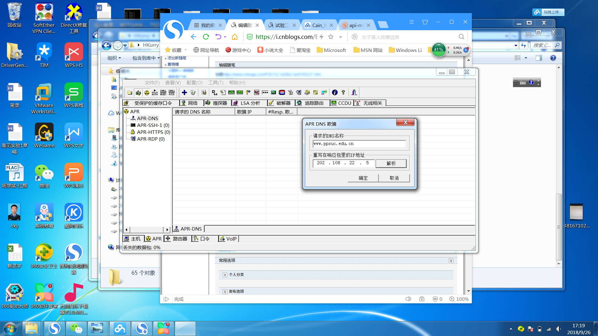 3.B同学扮演攻击者,设计攻击方法,使用CAIN,通过DNS欺骗的方式,让A同学访问www.ppsuc.edu.cn网址的时候,访问到另外一台机器上的伪造网站