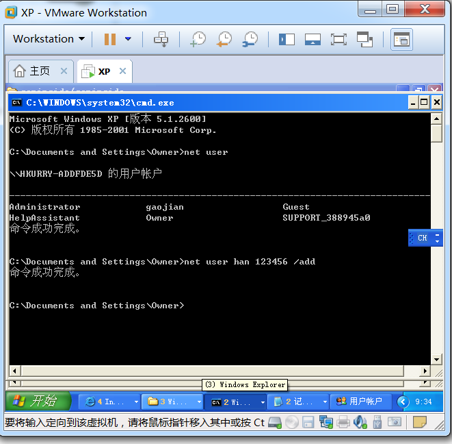 1.在windows xp系统中使用 net user gao gao123 /add添加用户gao,密码gao123的账户(用户名和密码可以自己设定);并使用net user命令确定用户添加成功。