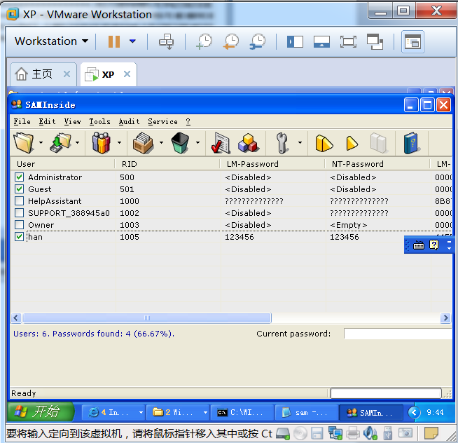 3.使用saminside软件将sam.txt导入,并进行破解,注意配置字典破解和暴力破解