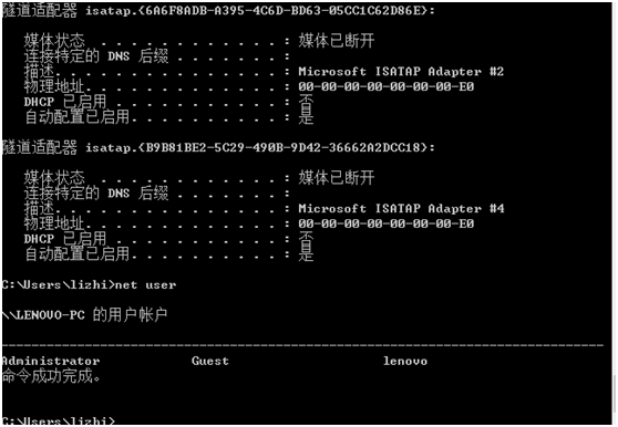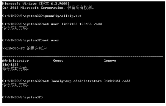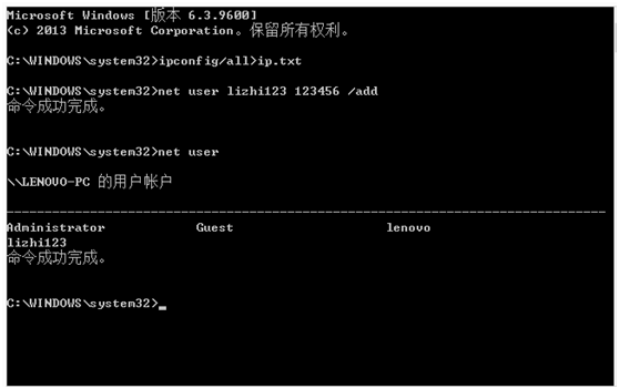 - net user lizhi123 123456 /add添加用户名为lizhi123,密码为123456的用户