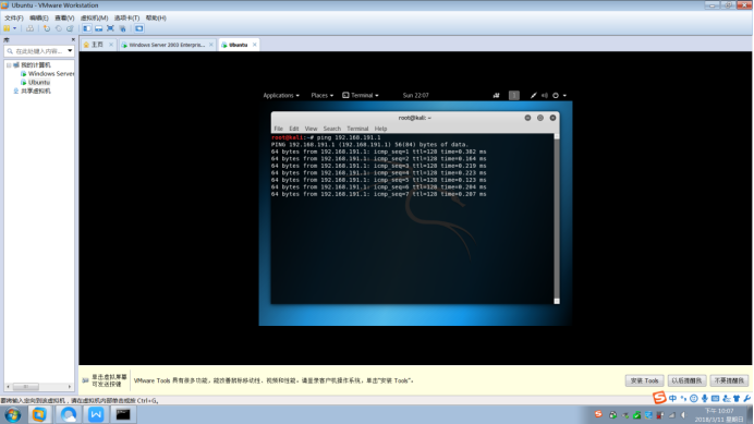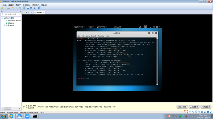 - 安装windows和linux(kali)两个虚拟机,均采用NAT网络模式,查看主机与两个虚拟机器的IP地址,并确保其连通性。同时为两个虚拟机做一个快照。
