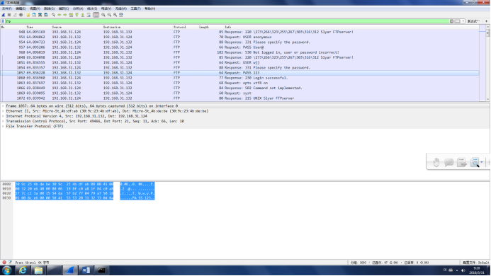 3.B同学在机器中安装Wireshark,并将其打开;之后用用户名和密码登陆A同学的FTP服务器,并上传一张图片。