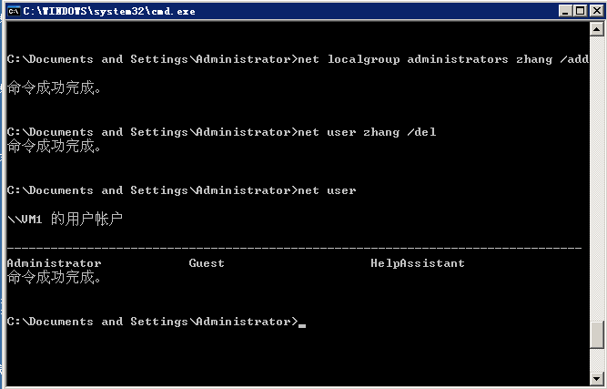 net localgroup administrators zhang /add添加用户名为zhang的用户到管理员组并删除