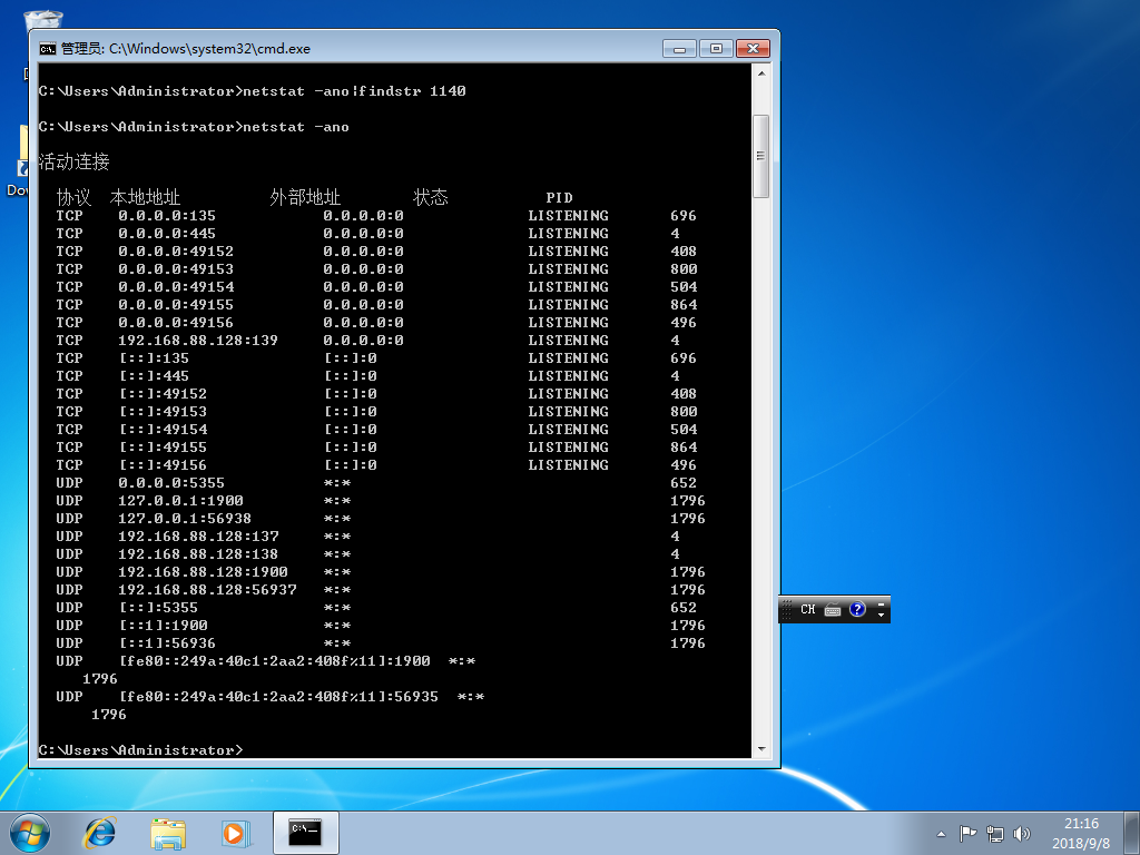 Netstat -ano查看网络链接状态,|是表示左边的输出作右边的输入,findstr是筛选条件。我的网络链接状态没有1140,所以没有输出,改用4筛选