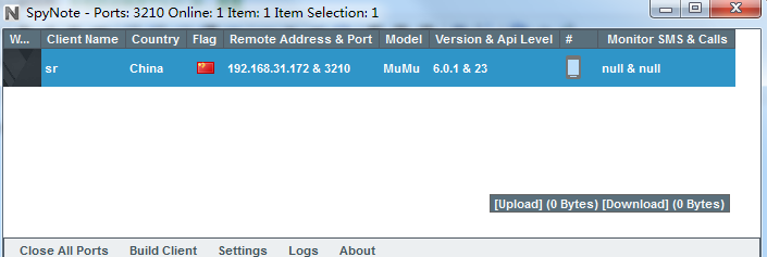 可以在spynote中看到有一台机器上线,并可以查看其基本信息。