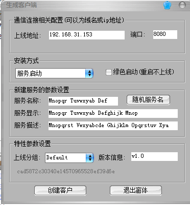 步骤二: 点击菜单栏中的“服务生成”,在弹出的配置服务端中,配置回连IP地址(攻击者IP)和端口号,并点击“生成”按钮,生成木马服务端。