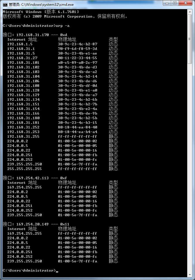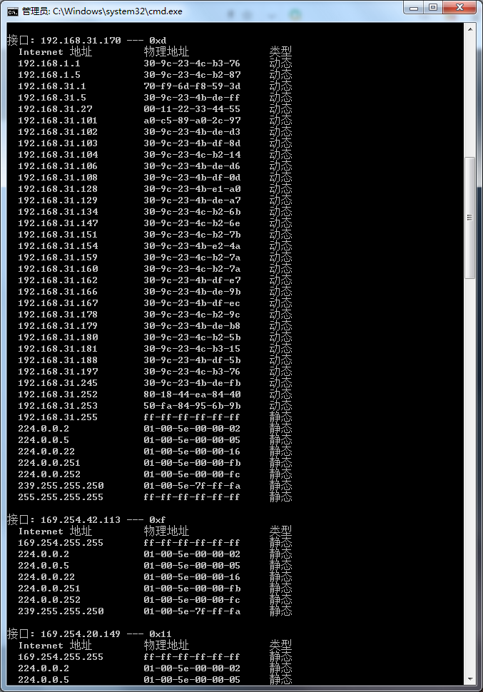 下图为欺骗开始后在192.168.31.170机器上用arp –a命令查询本机arp缓存表的情况,会发现缓存表中的网关对应的MAC地址变成了192.168.1.1号机(实施ARP欺骗的机器)的IP地址