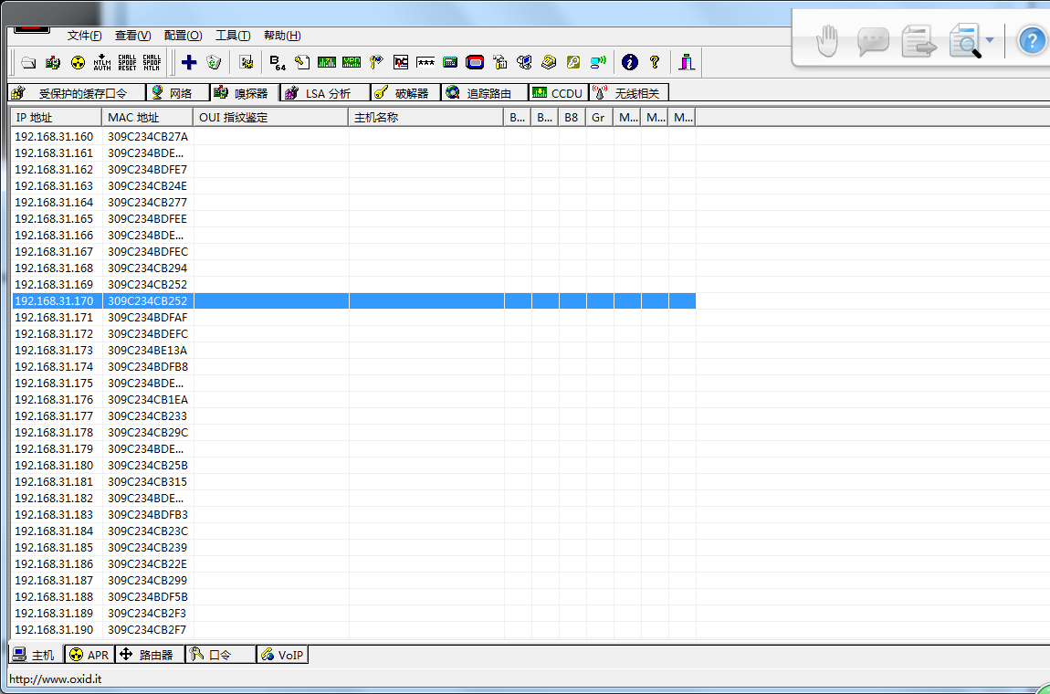 3、点选工具栏中的网卡图标,之后选择sniffer页,再选择左下角的hosts,右键选择“scan MAC address”,扫描局域网中的活动主机IP及MAC地址