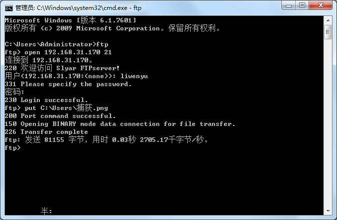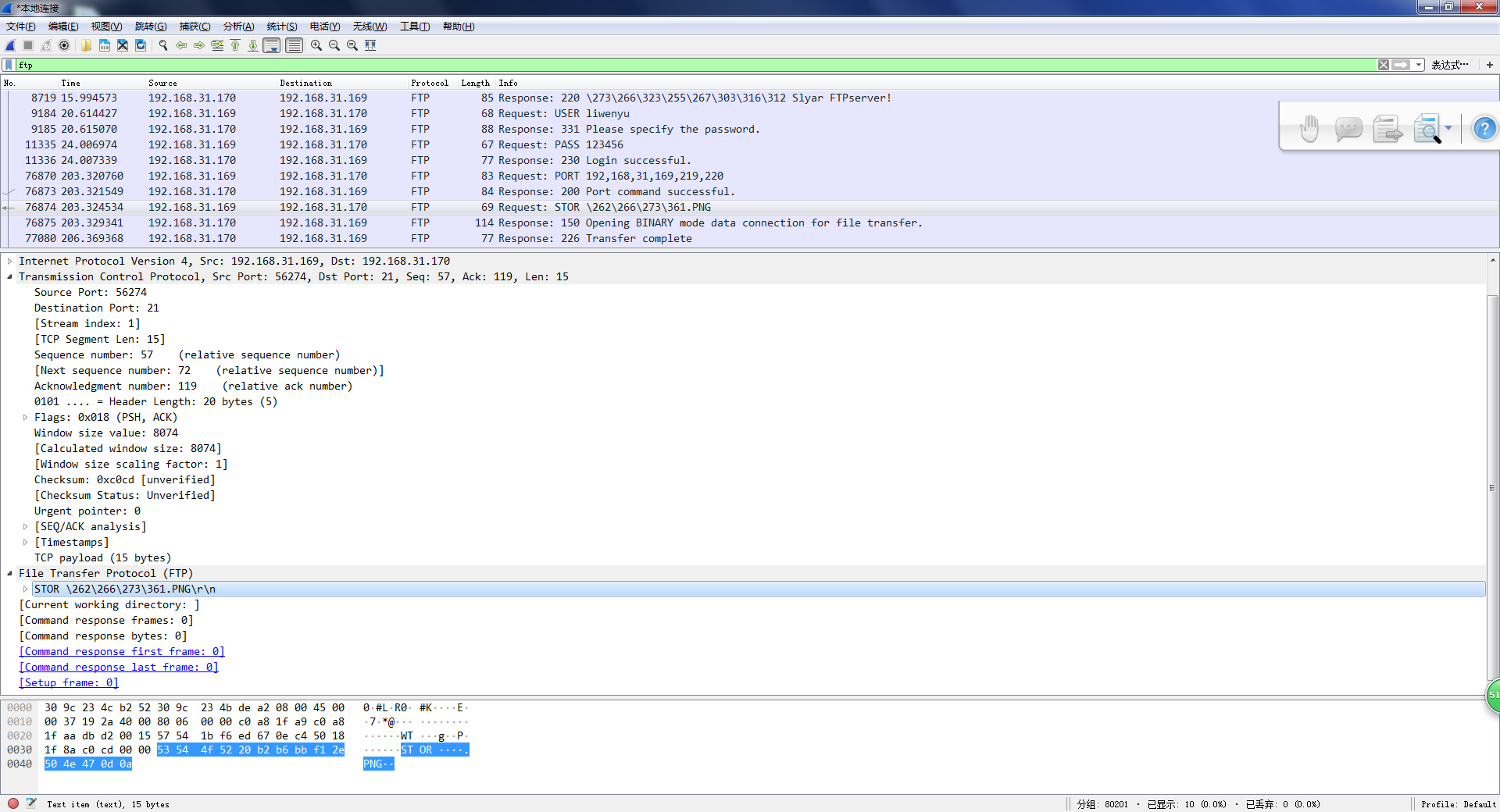 3.B同学在机器中安装Wireshark,并将其打开;之后用用户名和密码登陆A同学的FTP服务器,并上传一张图片。