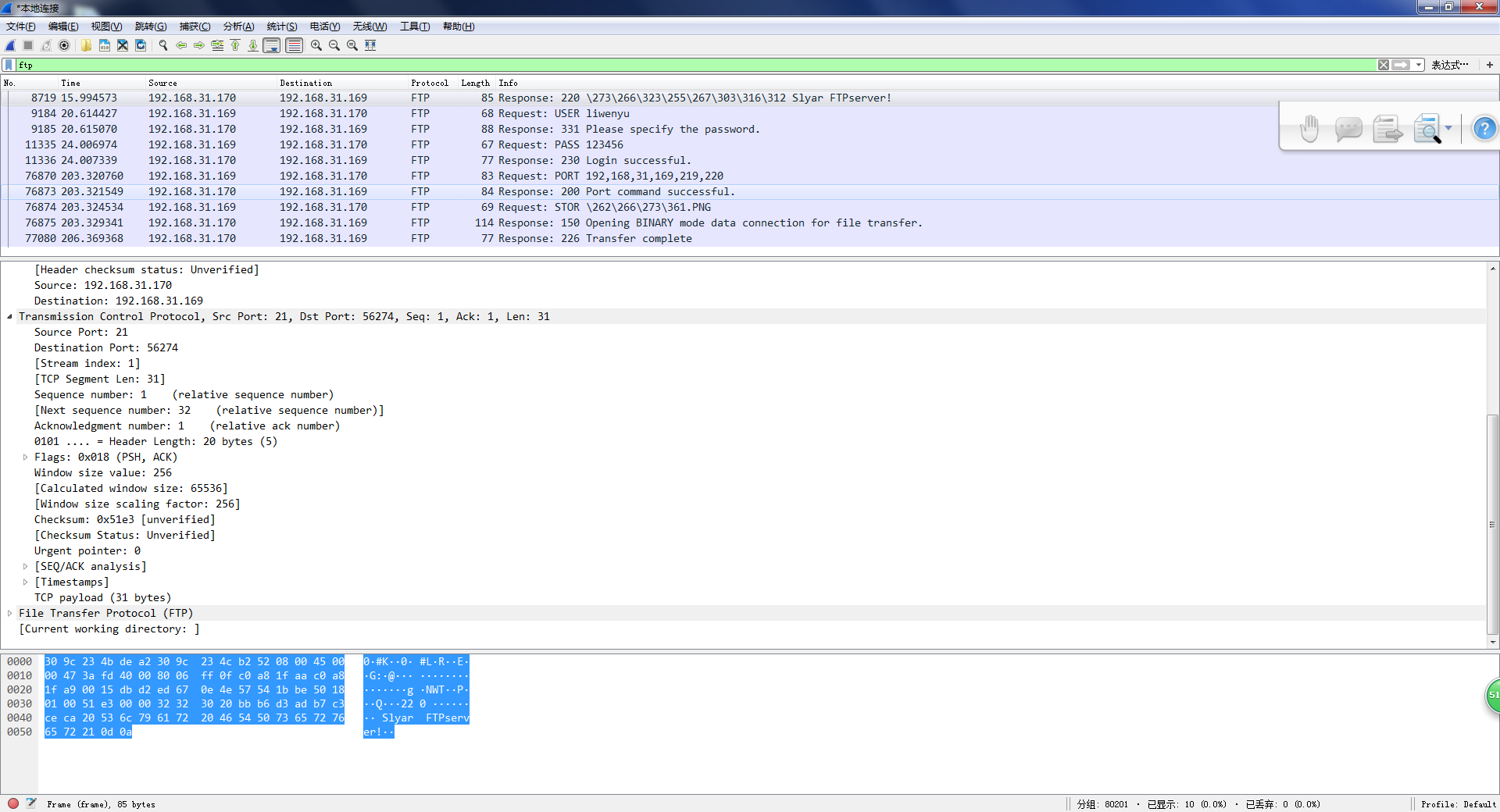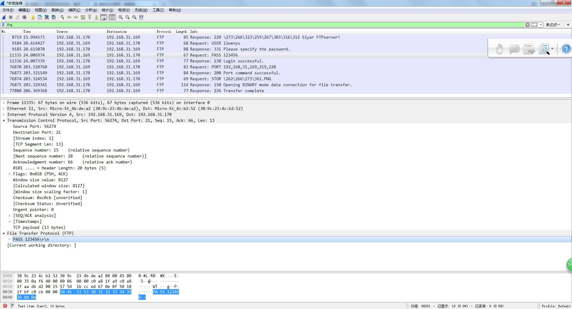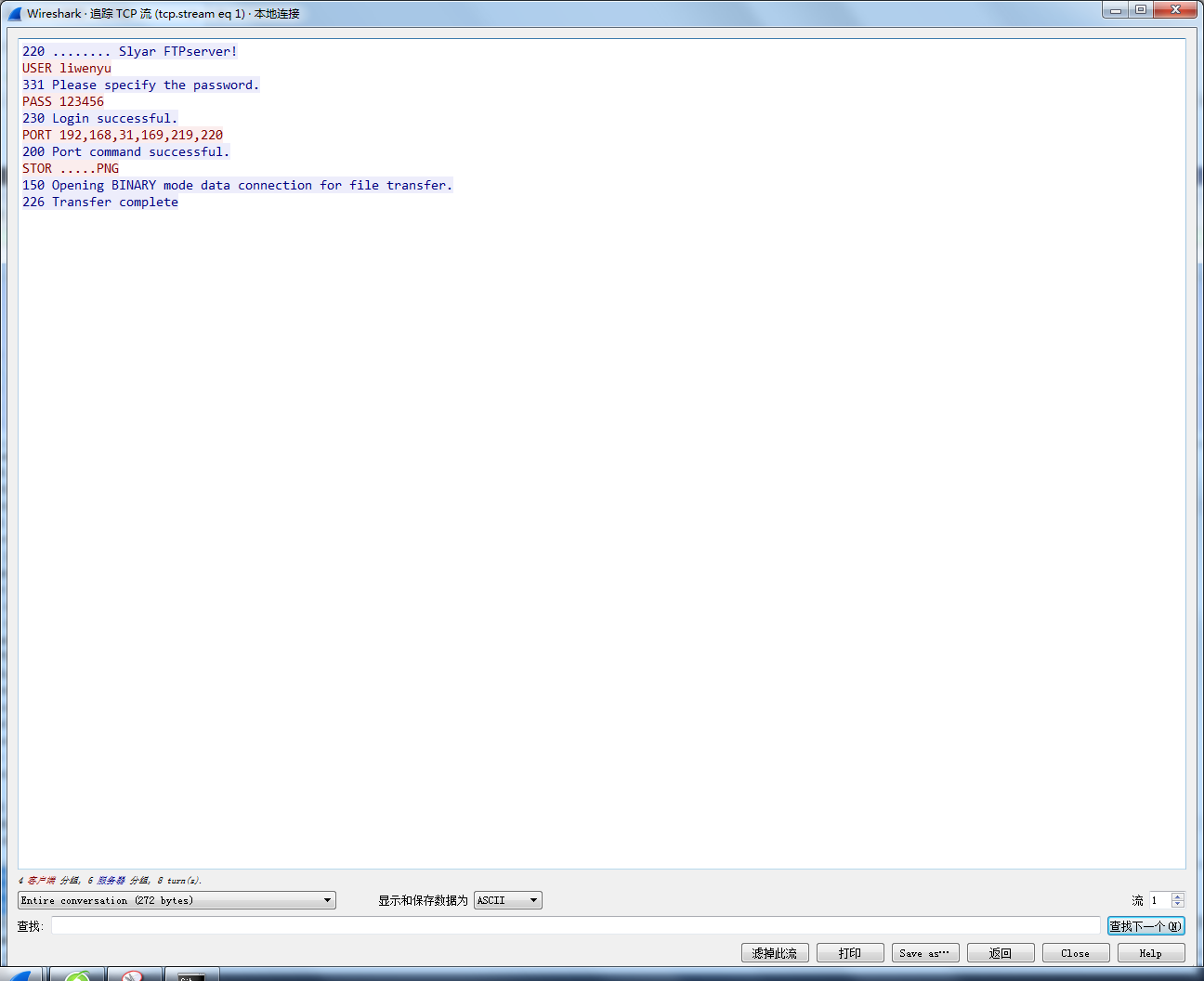 4.B同学停止Wireshark抓包,并和A同学一起分析数据包中的FTP登录过程,还原登录用户名和密码,以及上传文件。