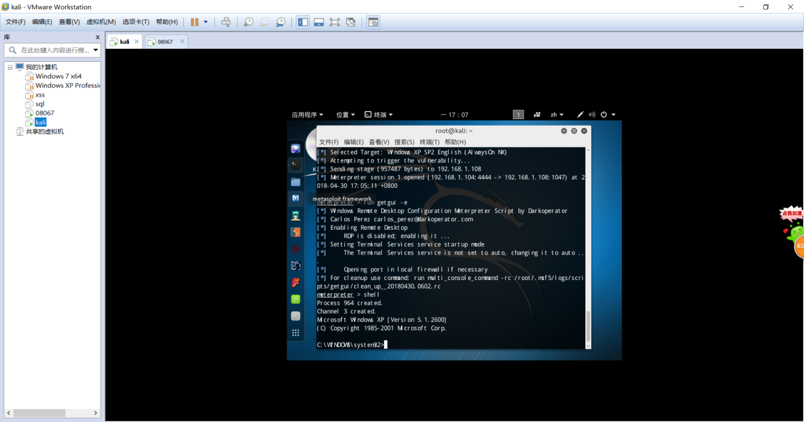 执行exploit命令后得到一个meterpreter命令行交互窗口