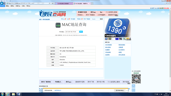 在一个案件中,获取了犯罪嫌疑人的一个MAC地址:40-16-9F-4E-7F-B4,请查询该MAC地址对应的厂商是(附截图)