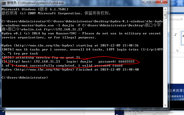 2.B同学使用hydra 对ftp用户的密码进行字典破解。hydra 中有关于该软件的使用命令语法。字典文件需要自己去生成。
