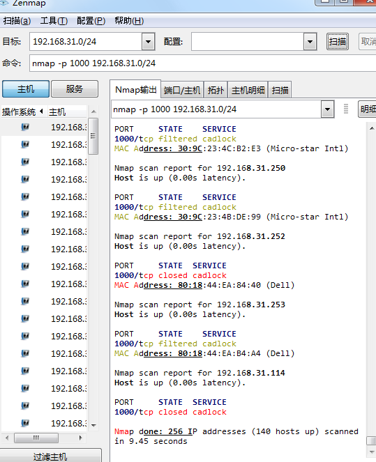 选择一个存活IP地址,扫描所开放的端口(分别用ping扫描,syn扫描尝试),并查询常用端口所对应的服务及操作系统信息。