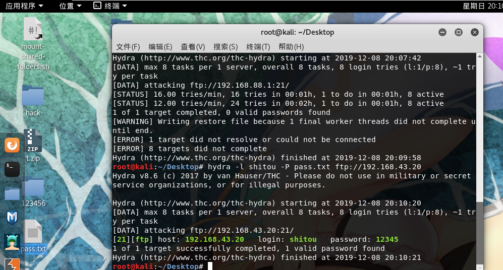 2.B同学使用hydra 对ftp用户的密码进行字典破解。hydra 中有关于该软件的使用命令语法。字典文件需要自己去生成。