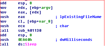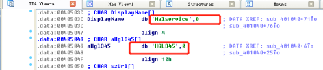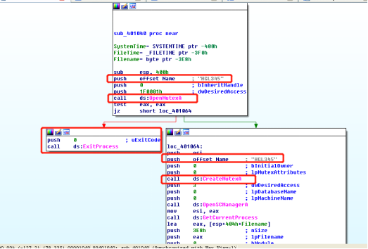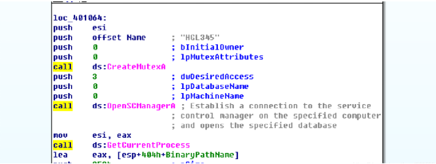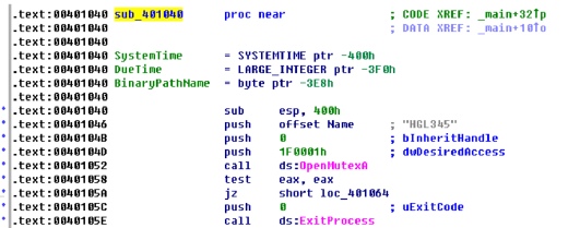 回到sub_401040,根据OpenMutexA 与push offest Name “HGL345”判断出互斥量在这里。