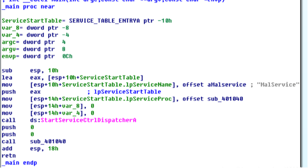 然后又将ServicesStartTable.lpServiceProc的值赋为了sub_401040,后面又调用了StartServiceCtrlDispatcherA