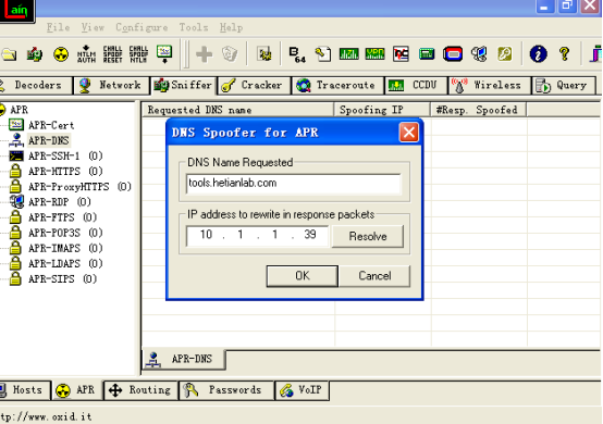 5.然后进入主机A,来到ARP欺骗界面。在空白区域右击,选择“Add to list”。“DNS Name Requested”表示对方(主机B)输入的url,下面的IP栏表示要将对方输入的url解析成的IP。这里我们输入的是“10.1.1.39”。