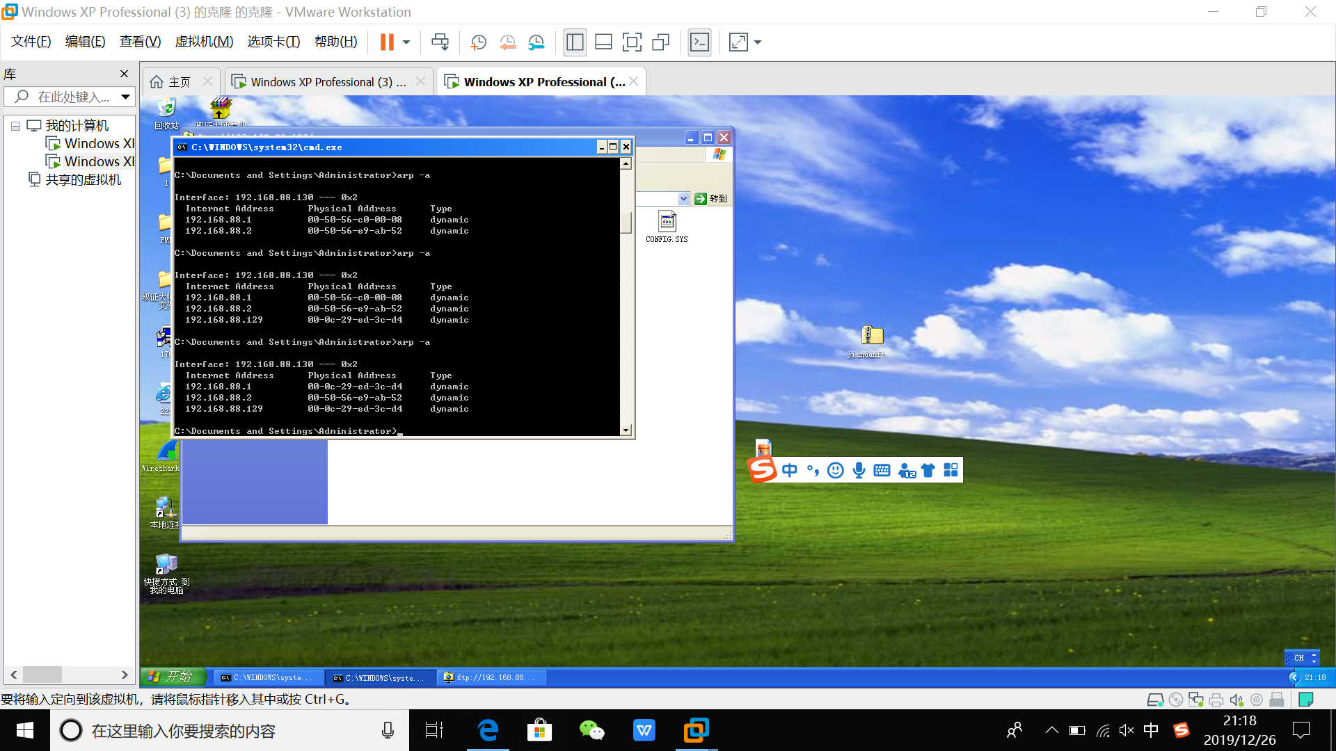 3. 我们在主机B上ping一下主机A,然后在cmd窗口输入“arp –a”。此时,在主机B看来,网关的MAC地址就是主机A的MAC地址了。主机B会把A作为网关。如下图所示。 主机B发往外界的数据包,会经过主机A,至此就完成了对主机B的ARP欺骗。