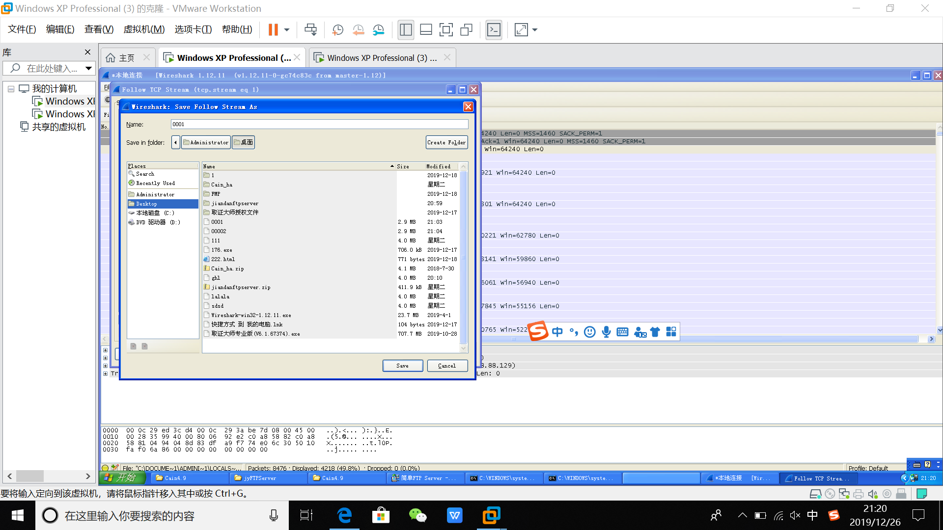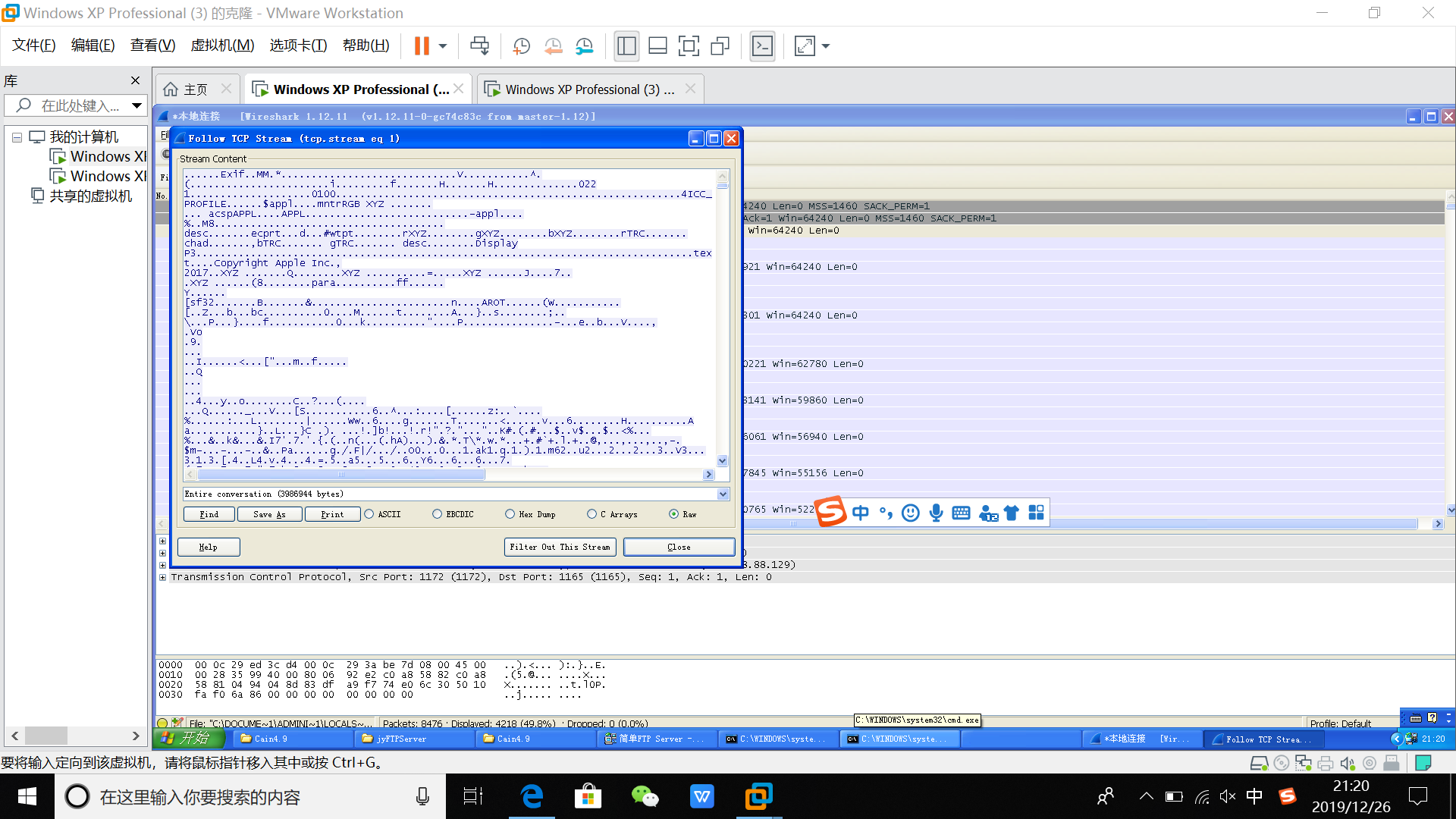 3.B主机中安装Wireshark,并将其打开;之后用用户名和密码登陆A主机的FTP服务器,并上传一张图片。B主机停止Wireshark抓包,并分析数据包中的FTP登录过程,还原登录用户名和密码,以及上传文件。