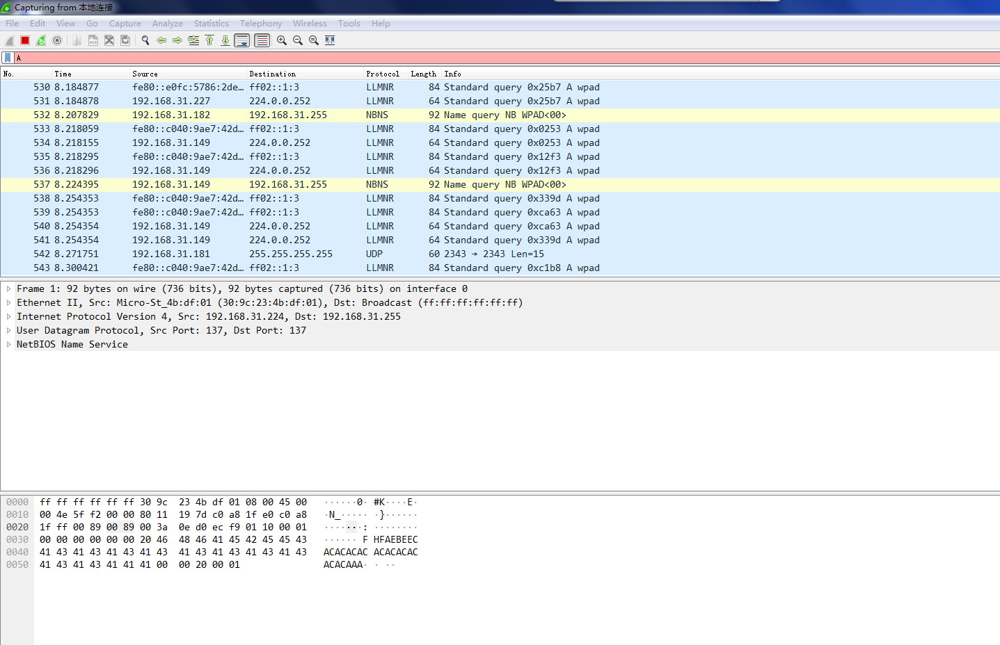 3.欺骗过程中,在主机A开启Wireshark进行抓包,分析APR欺骗攻击过程中的数据包特点。(附截图)