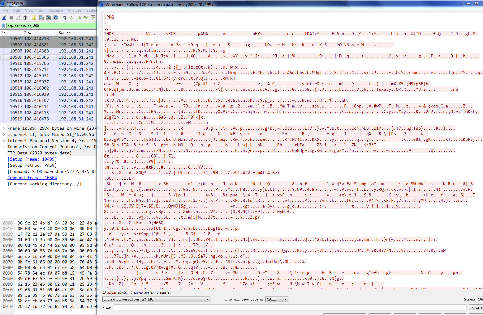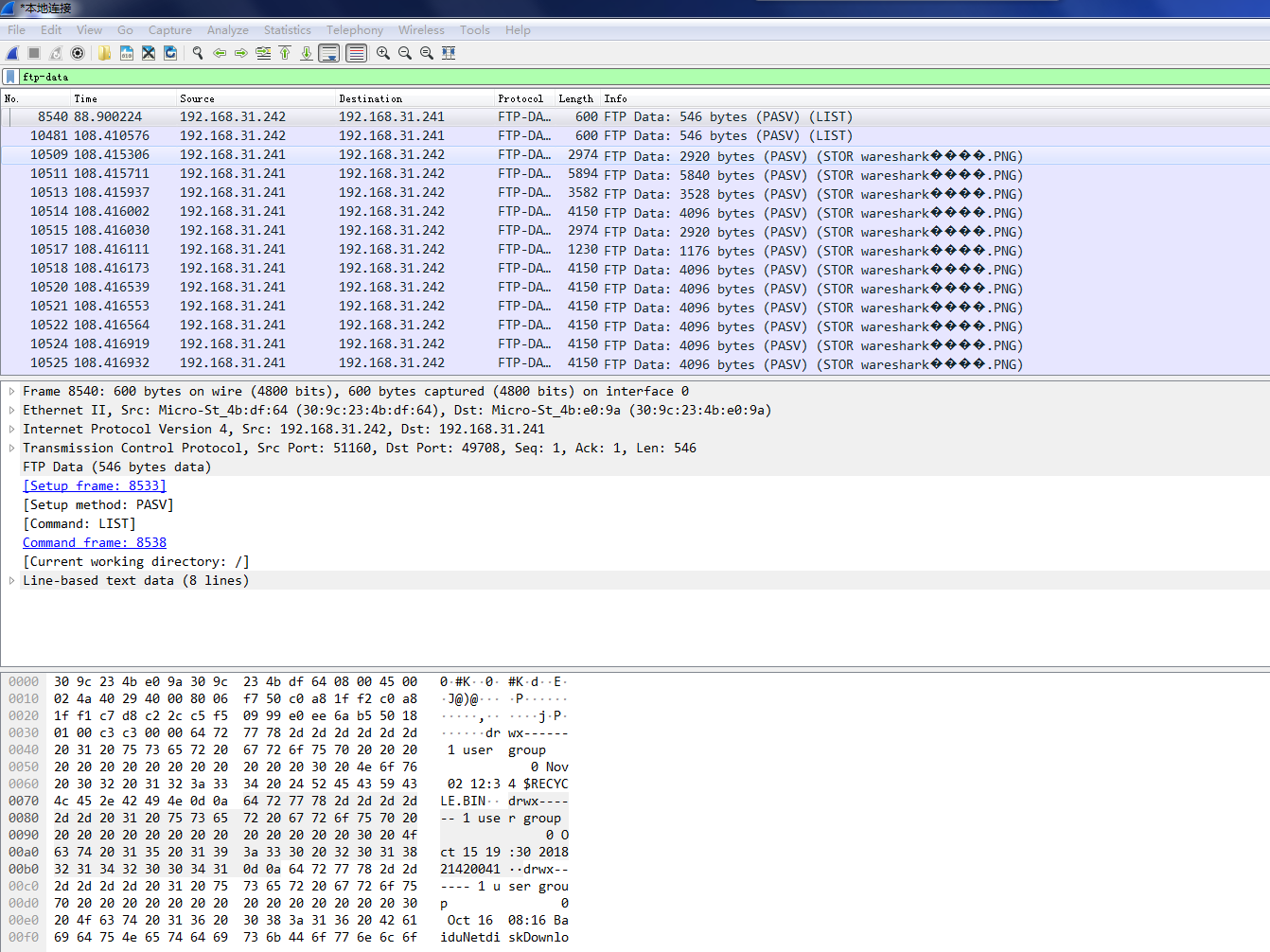 3.B同学在机器中安装Wireshark,并将其打开;之后用用户名和密码登陆A同学的FTP服务器,并上传一张图片。