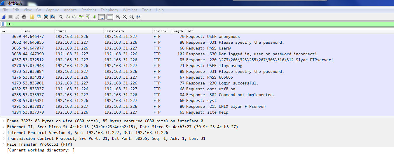 4.B同学停止Wireshark抓包,并和A同学一起分析数据包中的FTP登录过程,还原登录用户名和密码,以及上传文件。