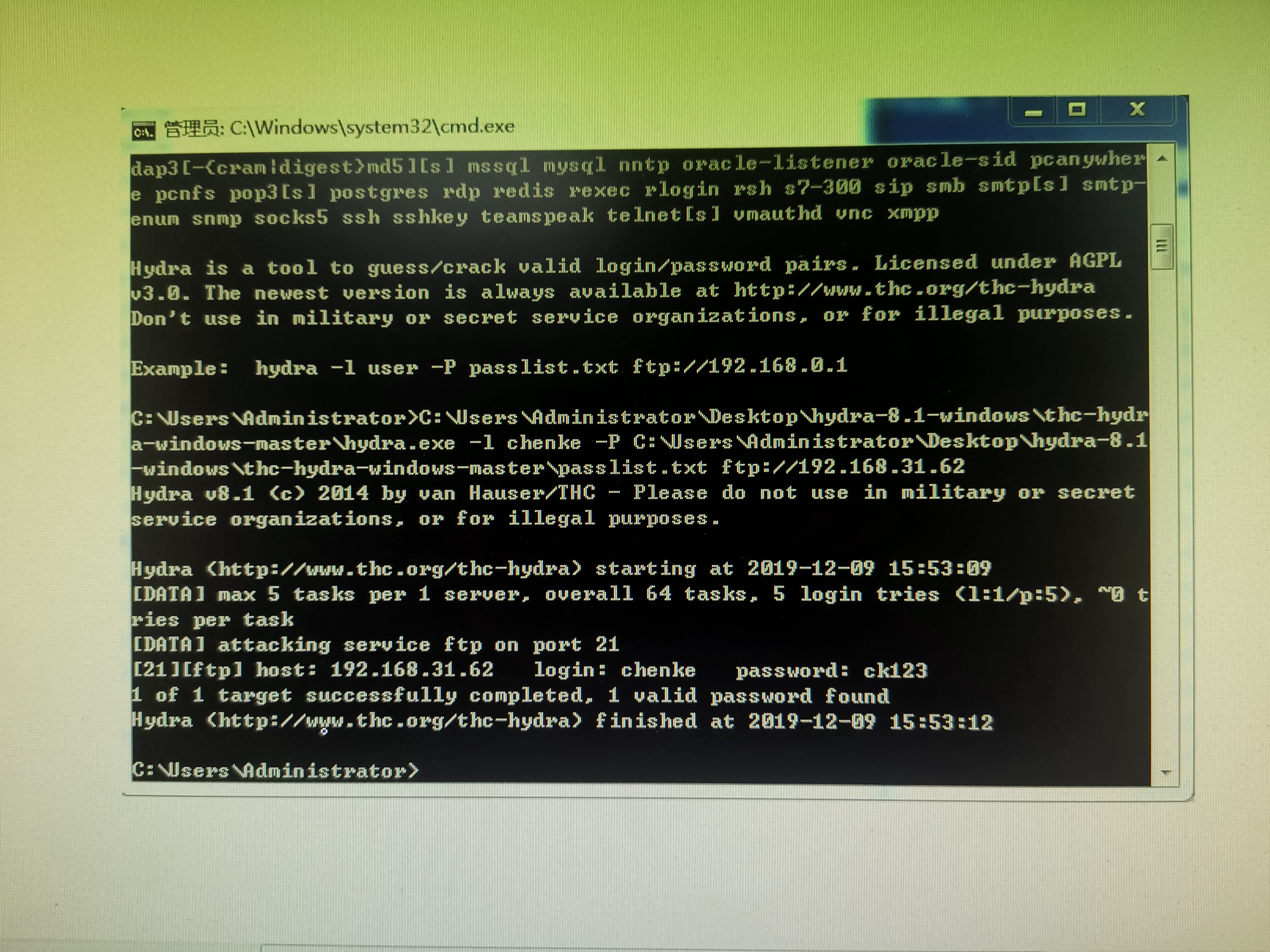 2.B同学使用hydra 对ftp用户的密码进行字典破解。hydra 中有关于该软件的使用命令语法。字典文件需要自己去生成。