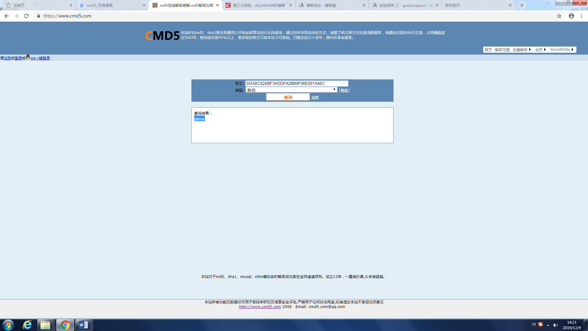 1. 请解密以下字符串35556C826BF3ADDFA2BB0F86E0819A6C。(附截图)