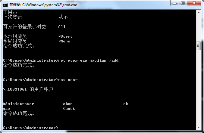 1.在windows xp系统中使用 net user gao gao123 /add添加用户gao,密码gao123的账户(用户名和密码可以自己设定);并使用net user命令确定用户添加成功。