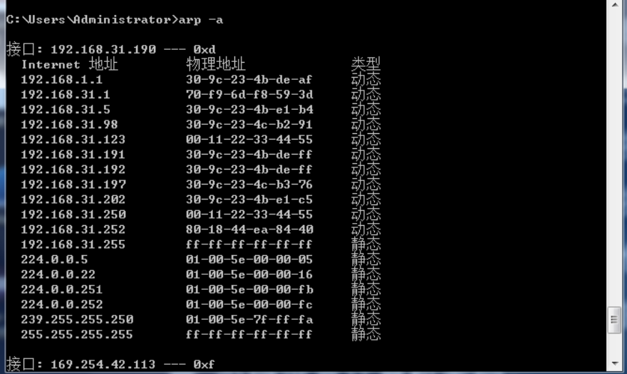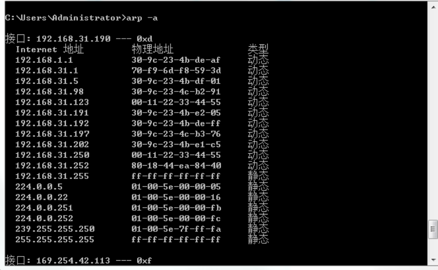 下图为欺骗开始后在192.168.31.190和192.168.31.191机器上用arp –a命令查询本机arp缓存表的情况,会发现缓存表中的网关对应的MAC地址变成了192.168.31.192号机(实施ARP欺骗的机器)的IP地址