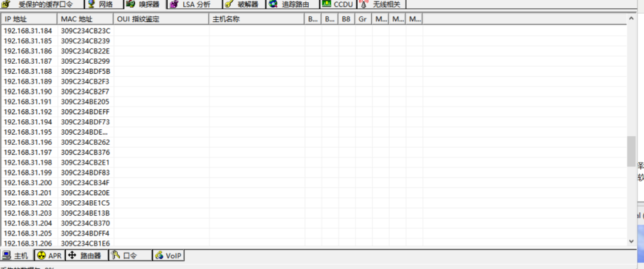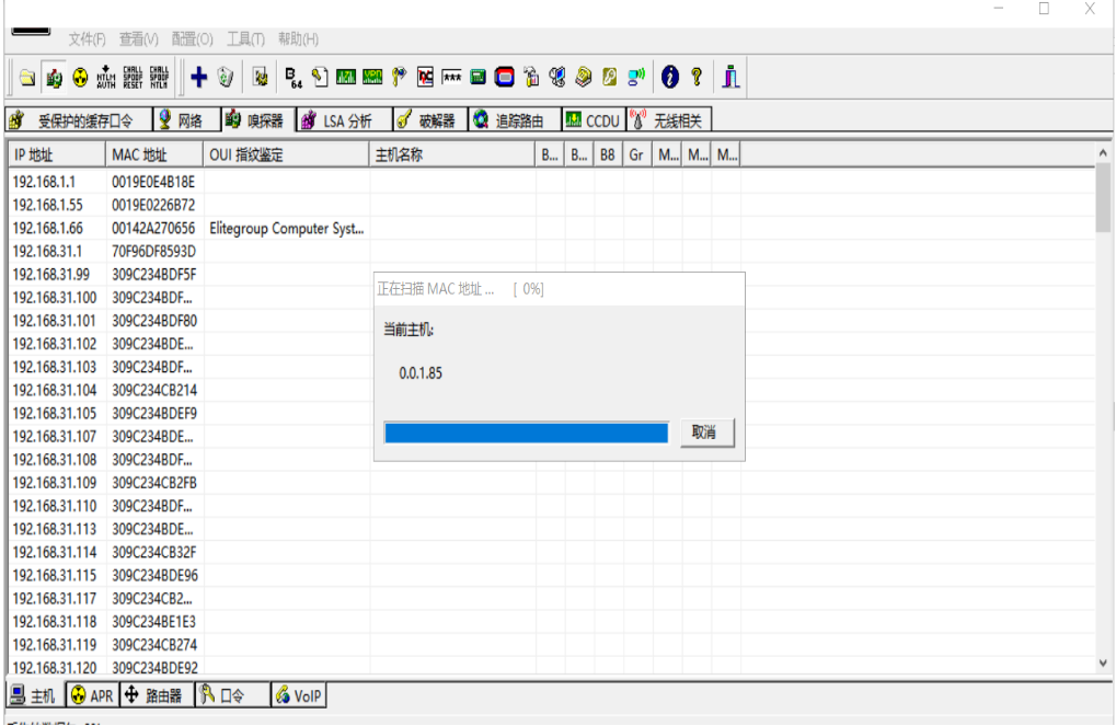 2、在A虚拟机上运行cain,选择要嗅探的网卡,点选工具栏中的网卡图标,之后选择sniffer页,再选择左下角的hosts,右键选择“scan MAC address”,扫描局域网中的活动主机IP及MAC地址