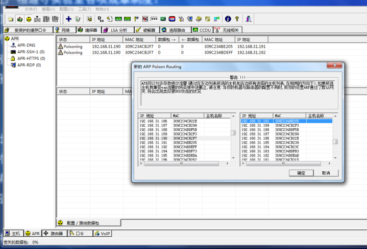3、选中ARP页-》点下列表栏空白处,大加号变为可选-》点大加号,在弹出的窗口中选择要嗅探的目标主机(注意这里的选择和单击欺骗嗅探不一样,左面直接点网关,其它机器自动出现在右侧列表中,这时需要按住ctrl键在右侧选择你需要嗅探的主机,点oK按钮,回到软件主窗体,如图所示
