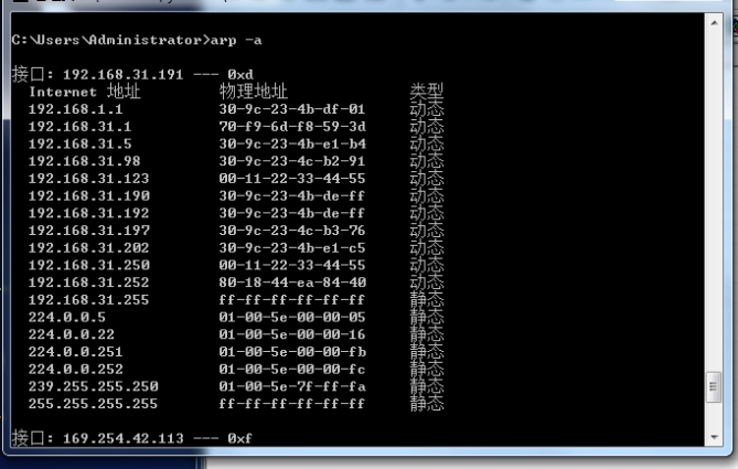 ARP欺骗前B虚拟机 192.168.31.191机正常缓存表和IP地址