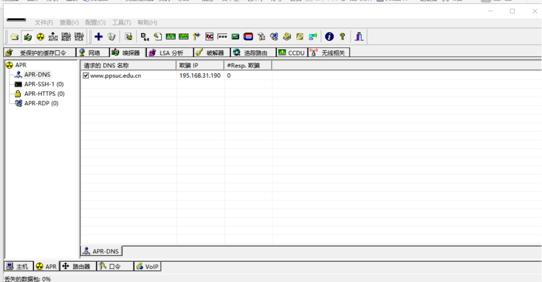 3.B同学扮演攻击者,设计攻击方法,使用CAIN,通过DNS欺骗的方式,让A同学访问www.ppsuc.edu.cn网址的时候,访问到另外一台机器上的伪造网站