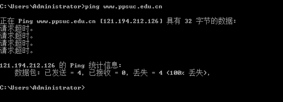 欺骗成功后,在被害机器上查看www.ppsuc.edu.cn的IP 查看是否被解析到了指定的IP地址上。由于系统原因,欺骗后只是不能上网,欺骗成功。
