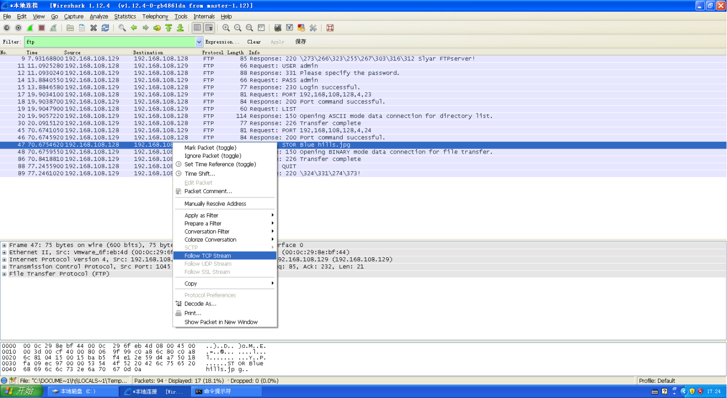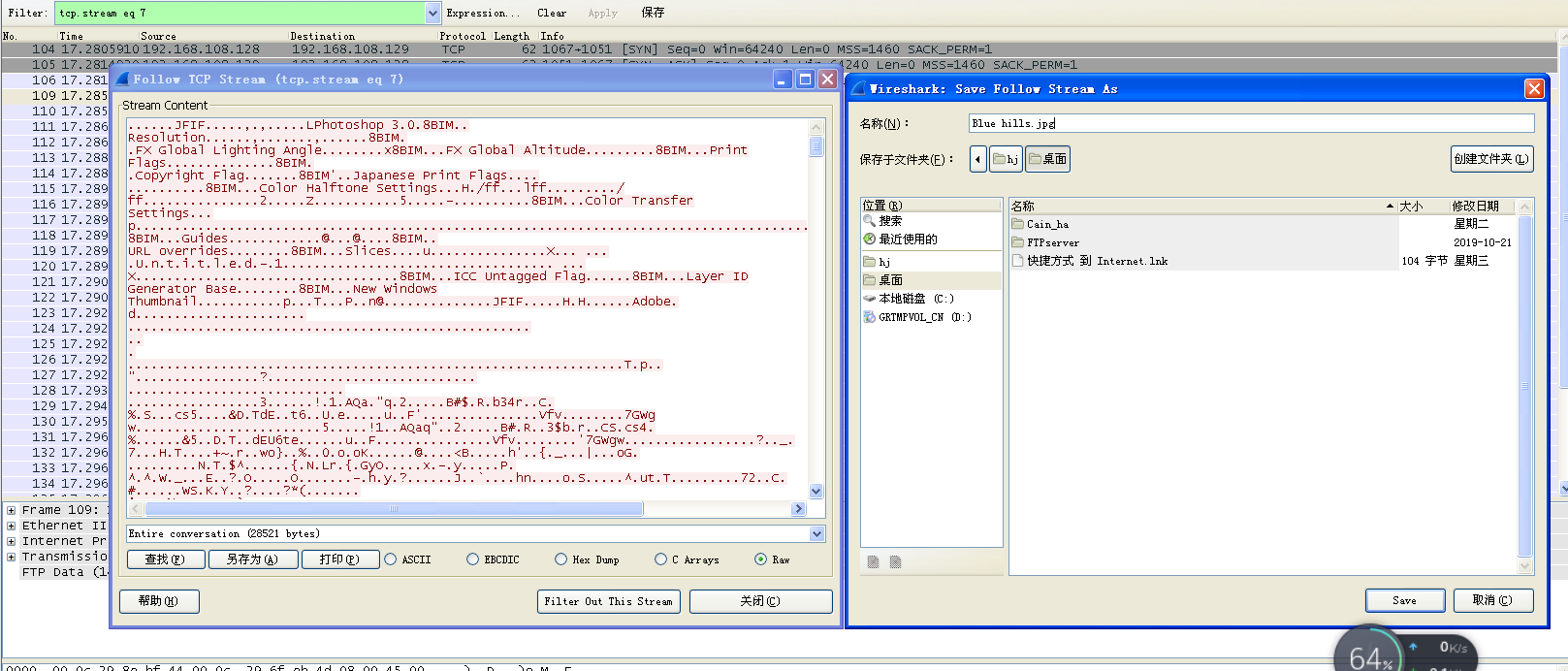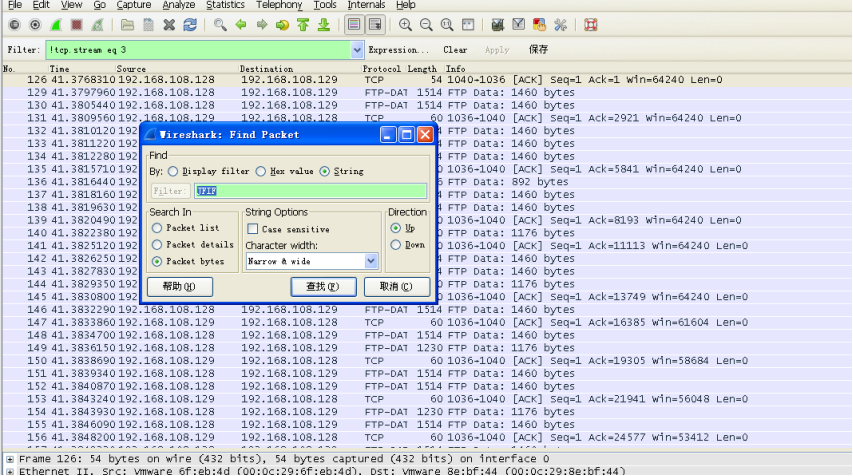 ctrl+F Find Packet 命名,做如下设置,得到ftp上传图片的数据包