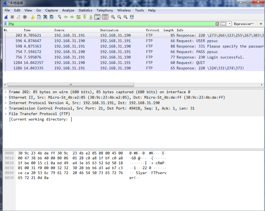 wireshark抓的包中,使用ftp筛查处出FTP登陆的过程,可以发现B登陆的用户名为ppsuc,密码为ppsuc