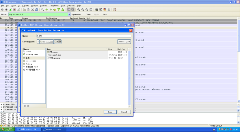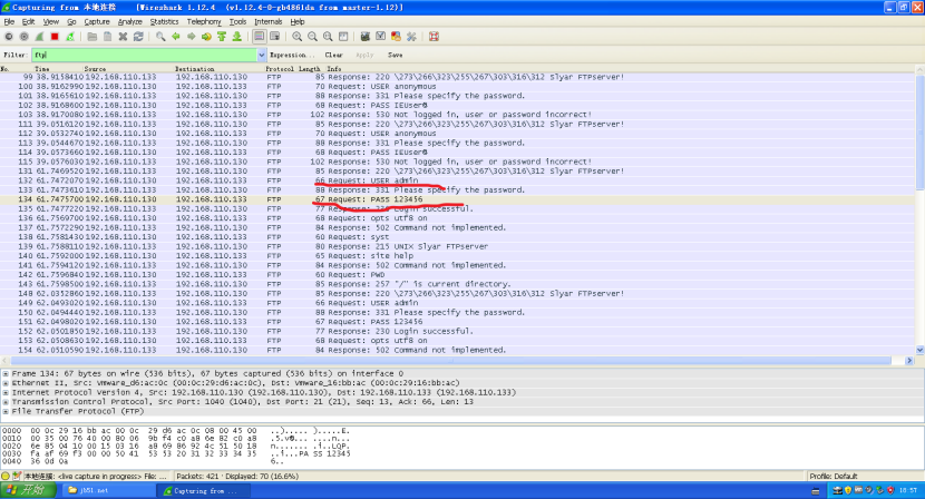 3.B同学在机器中安装Wireshark,并将其打开;之后用用户名和密码登陆A同学的FTP服务器,并上传一张图片。