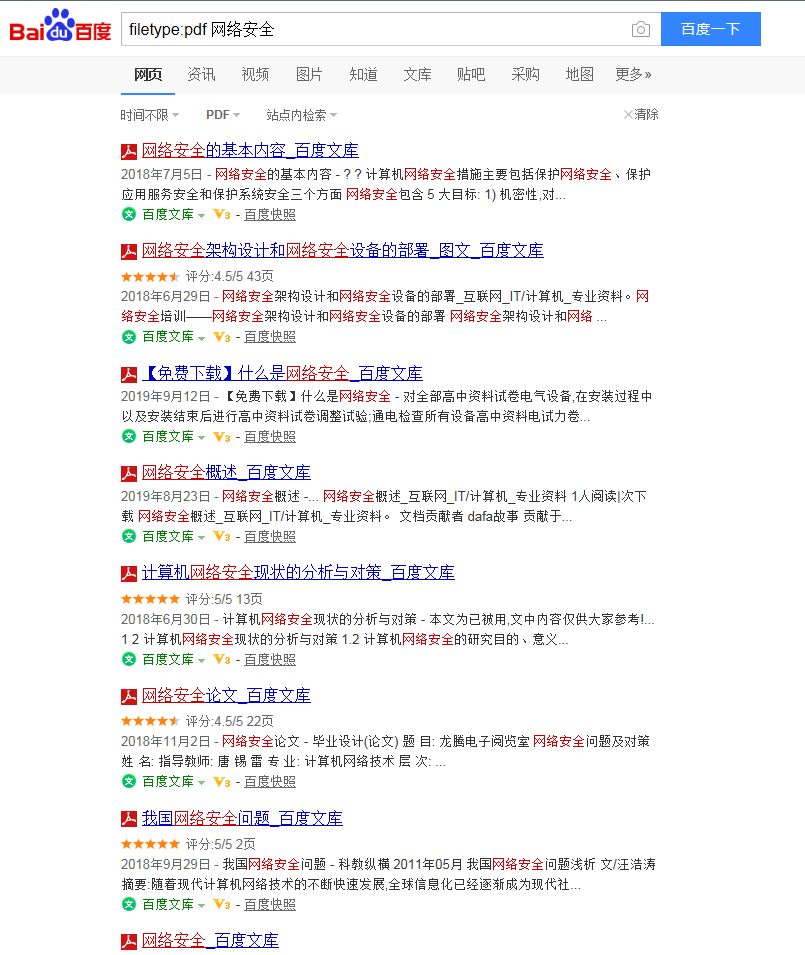 用百度或google搜索所有包含“网络安全”的pdf文档(附截图)