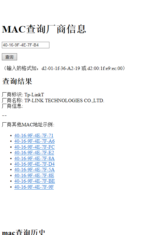 在一个案件中,获取了犯罪嫌疑人的一个MAC地址:40-16-9F-4E-7F-B4,请查询该MAC地址对应的厂商是(附截图)