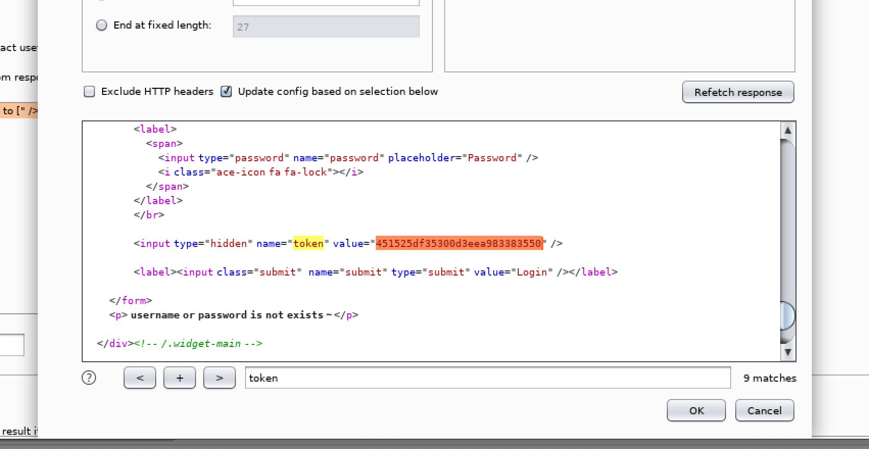 点击Refetch response 获取返回的包,找到返回的token值,选中并复制下来。点击确定(注意:一定要在选中token的状态下点击确定)